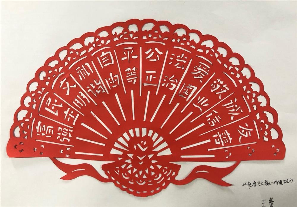 園區(qū)投資公司王蕾的作品《社會主義核心價值觀》獲得二等獎,作者以緊密有致的扇形設計將社會主義核心價值觀這個主題巧妙的呈現(xiàn),作品畫面均衡、線條流暢,美觀大方,有較高的藝術性和觀賞性。