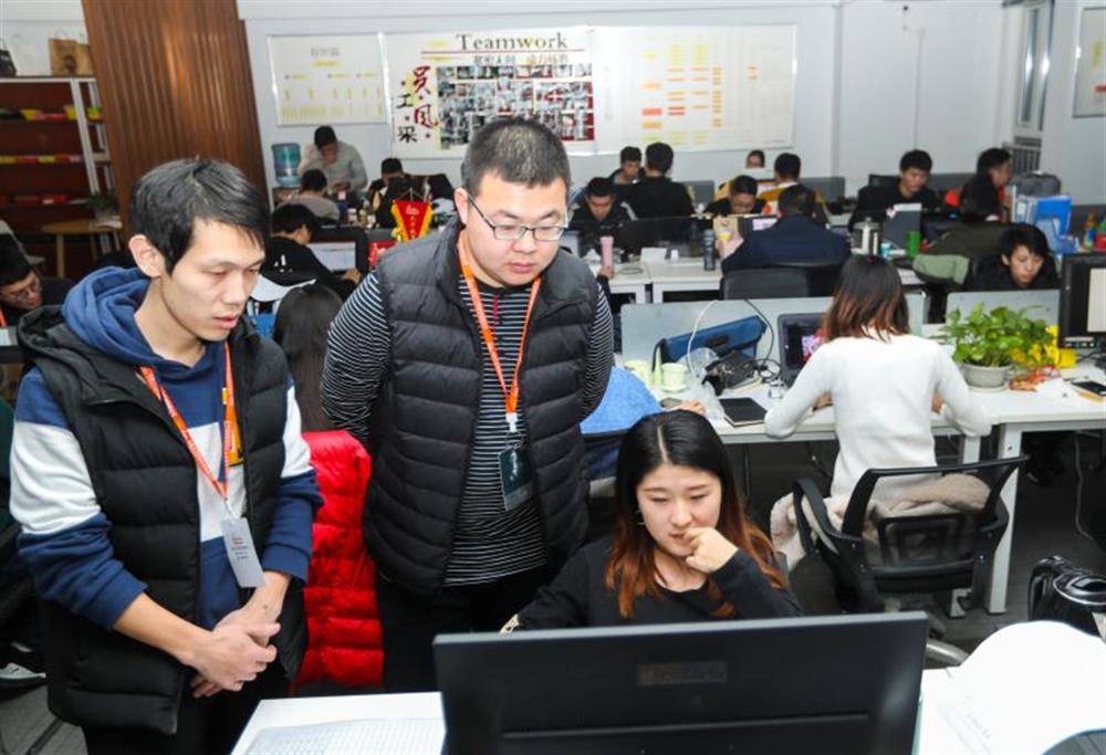在4樓眾創(chuàng)空間,聚集著50多家在孵跨境電商企業(yè),多數(shù)都是90后創(chuàng)業(yè)人員。25日臨近傍晚6點,不少創(chuàng)客仍埋頭忙碌。在眾創(chuàng)空間打造的咖啡吧,幾個年輕人正探討業(yè)務。